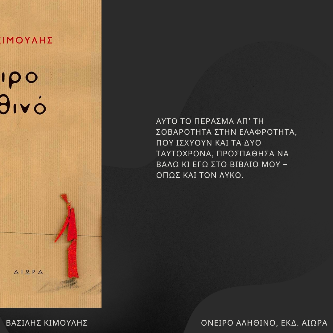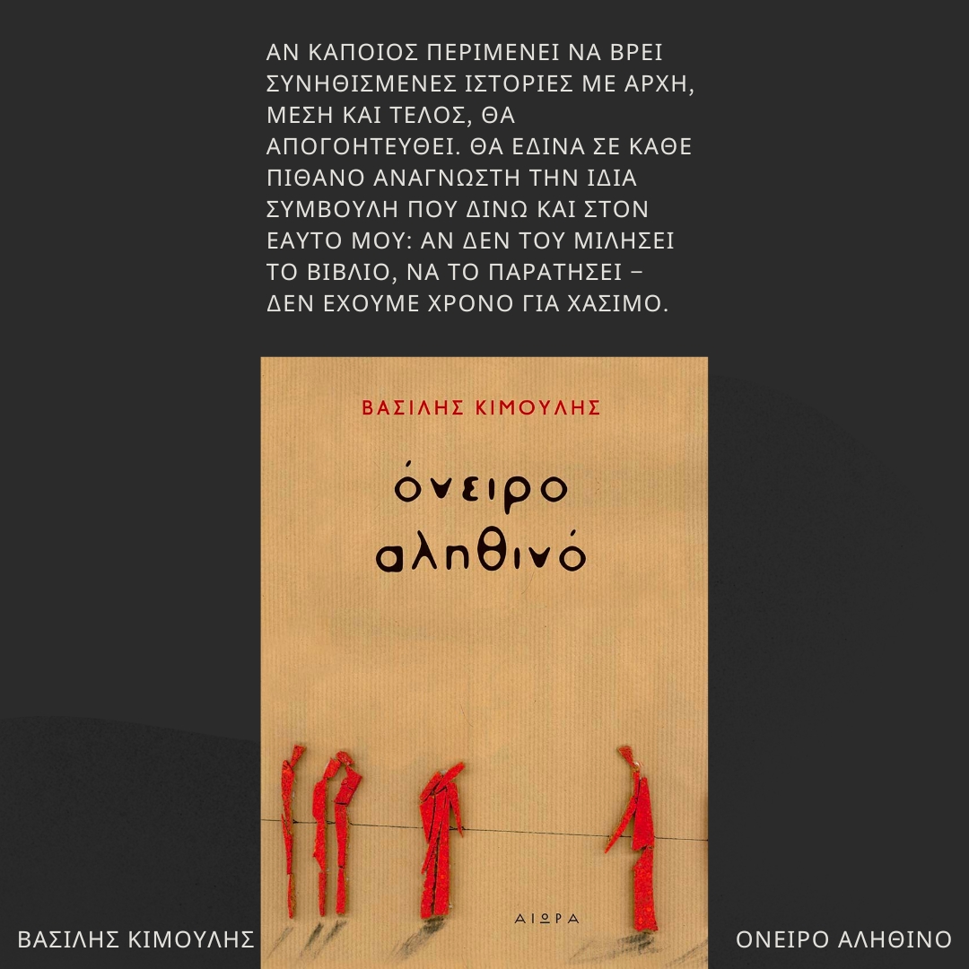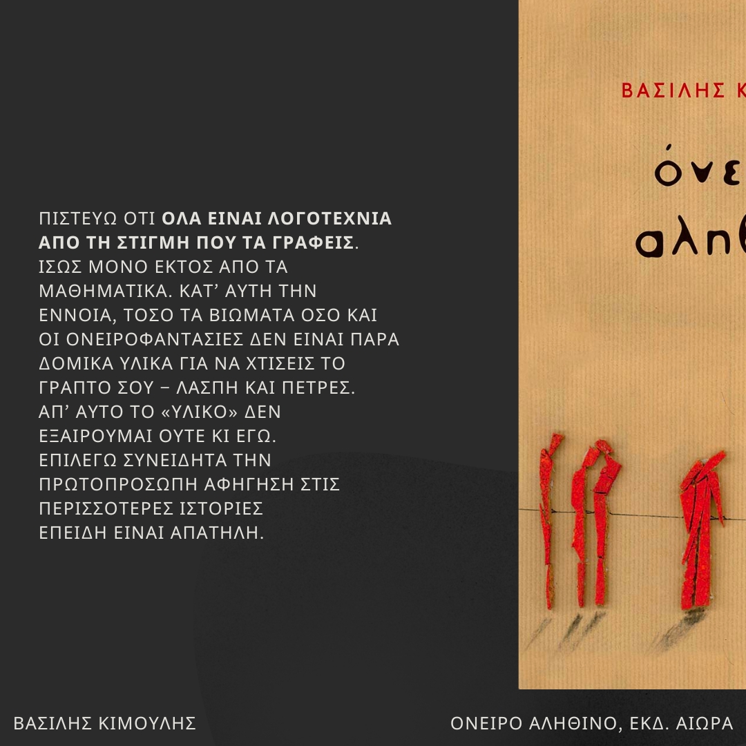 T ο Όνειρο αληθινό του Βασίλη Κιμούλη είναι ένα βιβλίο που «ψάχνει και ψάχνεται» κινούμενο μεταξύ πραγματικότητας και ονείρου. Είναι αφιερωμένο στη συγγραφέα Μαργαρίτα Καραπάνου και στα είκοσι ένα αφηγήματά του μεταξύ μυθοπλασίας και αυτό-μυθοπλασίας, παρελαύνει μια λεγεώνα προσώπων, υπαρκτών και φανταστικών. «Ψήγματα της ζωής και των πράξεών τους, οι λέξεις και οι στίχοι τους, ανεκδοτολογικές πληροφορίες κι αληθινά στοιχεία αναμειγνύονται με εντελώς φανταστικές επινοήσεις σε βαθμό που ούτε ο συγγραφέας μπορεί να ξεχωρίσει ποιος είναι ποιος, τι είναι τι…» λέει στο Vivlio-life ο δημιουργός. Από τη συνομιλία μας κράτησα πολλά, όπως την ενδιαφέρουσα απάντησή του στην ερώτηση αν πιστεύει πως στην λογοτεχνία πρέπει να υπάρχουν κάποια όρια στην υπερβολή: «Με εκφράζει η Παροιμία της Κόλασης του Ουίλιαμ Μπλέικ: «Ο δρόμος της υπερβολής οδηγεί στο παλάτι της σοφίας».